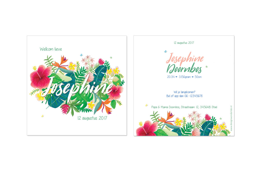 Vrolijk, zomers en kleurrijk. Dat is dit bijzondere geboortekaartje zeker! Door de print met tropische bloemen krijg je meteen een heerlijk gevoel. En door de intense kleuren is dit ook nog eens een stoer kaartje. Dit kaartje is ook geschikt voor zowel jongens als meisje.