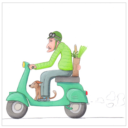 Opa op de scooter met zijn hond en de boodschappen. Deze scene zag ik op straat en moest ik toen meteen tekenen. Deze illustratie maakte ik tijdens mijn 100 dagen illustratie project. 100 dagen lang maakte ik elke dag een nieuwe illustratie. Soms haalde ik mijn inspiratie letterlijk van de straat. Alle illustraties kan je terugzien op mijn instagram account.